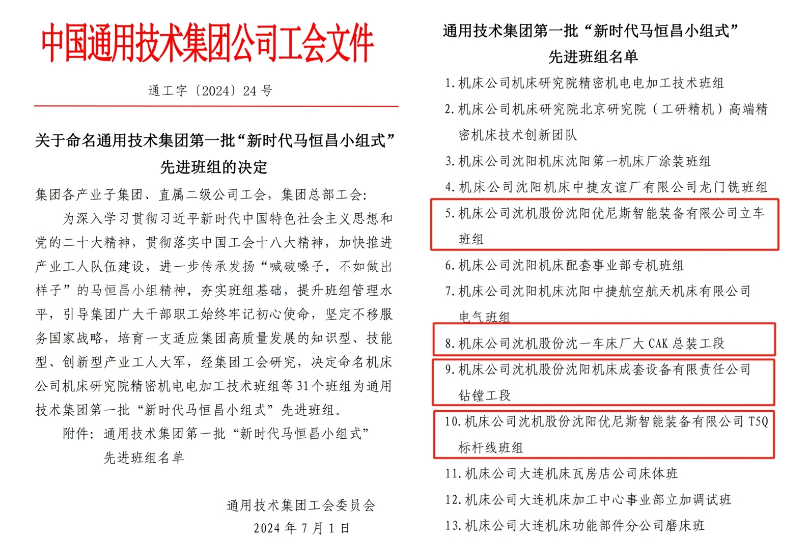 7月1日,集团命名首批31个“新时代马恒昌小组式”先进班组,沈阳优尼斯智能装备有限公司立车班组、沈一车床厂大 CAK总装工段、沈阳机床成套设备有限责任公司钻镗工段、沈阳优尼斯智能装备有限公司T5Q标杆线班组等四个班组喜获“新时代马恒昌小组式”先进班组称号。